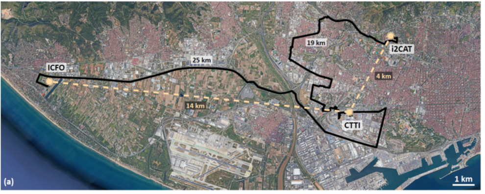 Map of Barcelona with the fiber network where entangled photons travelled. The quantum memory and the source were at ICFO.
