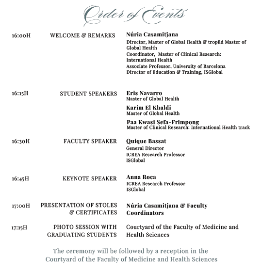 Anna Roca was invited to be the keynote speaker at the Master’s graduation ceremony of the Faculty of Medicine and Health Sciences at the University of Barcelona. She delivered an inspirational talk about her career to all the graduating alumni.