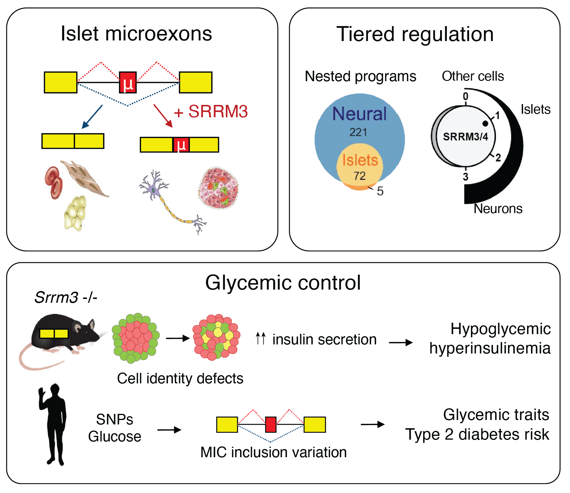 Pancreatic islets play a crucial role in maintaining blood glucose levels through the balanced secretion of insulin and other hormones. Dysfunction of islet cells leads to metabolic disorders such diabetes and rare forms of congenital hypoglycemia. While genomic organization and transcriptional regulation has been extensively studied in islet cells, little is known about the impact of alternative splicing, the process that allows single genes to produce multiple protein isoforms.Here, we compared RNA catalogs from multiple tissues and cell types to identify alternative exons preferentially included in islet cells. We found that the alternative splicing landscape of islets is dominated by an evolutionarily conserved program of microexons, extremely short exons (3-27 nucleotides) previously found largely only in neural cells. Islet microexons (which we termed IsletMICs) respond to changes in glucose concentrations, and are frequently included in genes related to hormone secretion and risk of type 2 diabetes (T2D). Moreover, we found they are regulated in islets by a protein called SRRM3.To understand the function of IsletMICs in glucose homeostasis, we combined assays in cell cultures and mice. We observed that mis-regulation of IsletMICs causes morphological and functional defects in islets, leading to impaired insulin secretion and glucose homeostasis, which causes pathologically low glucose levels (hypoglycemia) in mice. Moreover, we found that human genetic variants that influence SRRM3 expression are associated with increased fasting glucose and T2D risk.Together, our data provide multiple lines of evidence that IsletMICs have important roles in modulating islet function, particularly affecting processes involved in the regulation of insulin secretion. Our findings also suggest that changes in the activity of SRRM3 and its microexon targets in islets affect glucose homeostasis in humans, potentially contributing to T2D predisposition.